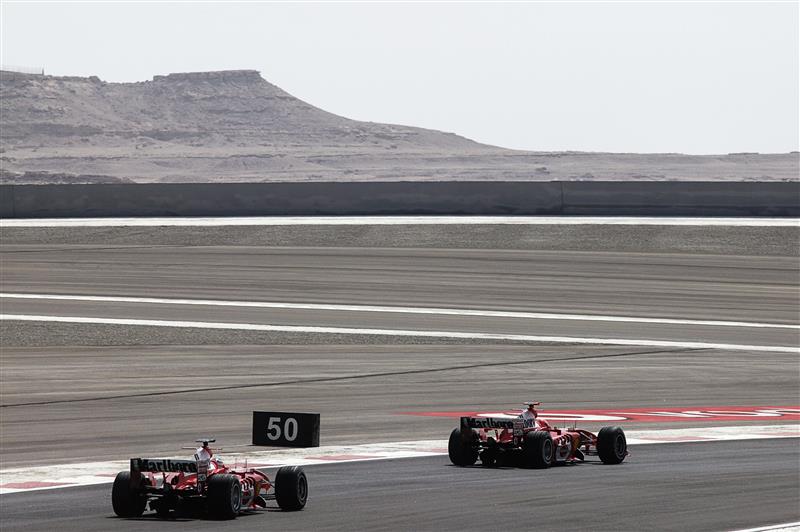De twee Ferrari’s aan kop tijdens de race in Bahrein. (Getty Images)