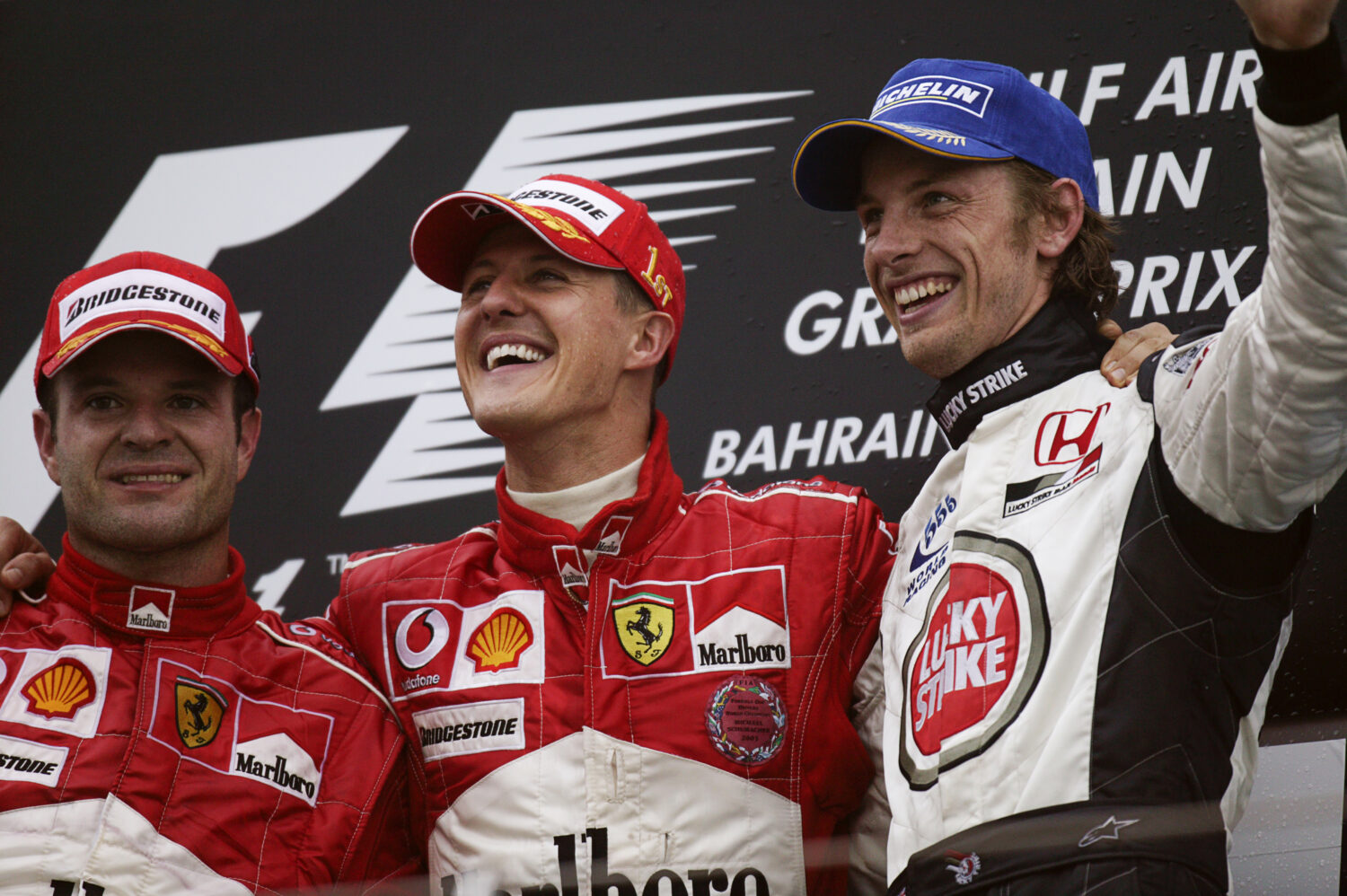 Het podium van de Grand Prix van Bahrein. Links Rubens Barrichello, midden Michael Schumacher en rechts Jenson Button. (Getty Images)
