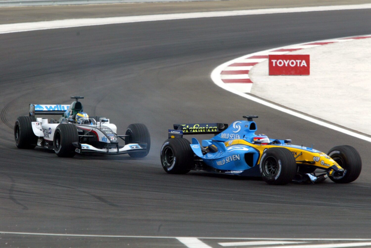 Achter de dominante Ferrari van Schumacher speelde het spektakel zich vooral af in het middenveld. David Coulthard probeerde Mark Webber onder druk te zetten, maar kwamer niet langs. Fernando Alonso liep schade op aan zijn voorvleugel en verloor plekken door een pitstop. Kimi Räikkönnen kende een sterke start en won meerdere posities, maar verremde zich later in gevechten om plaatsen. In de eerste bochtencombinatie raakten Ralf Schumacher en Takuma Sato elkaar. Na licht contact belandde de jongere Schumacher in het grind, al kon hij zijn weg vervolgen. Ook verderop in de race werd er gevochten. Alonso wist Felipe Massa uiteindelijk in te halen waarna ook Ralf Schumacher de Braziliaan voorbij ging. In een duel met Mark Webber liet Alonso later zijn onvrede blijken over de rijstijl van de Australiër door een handje op te steken.