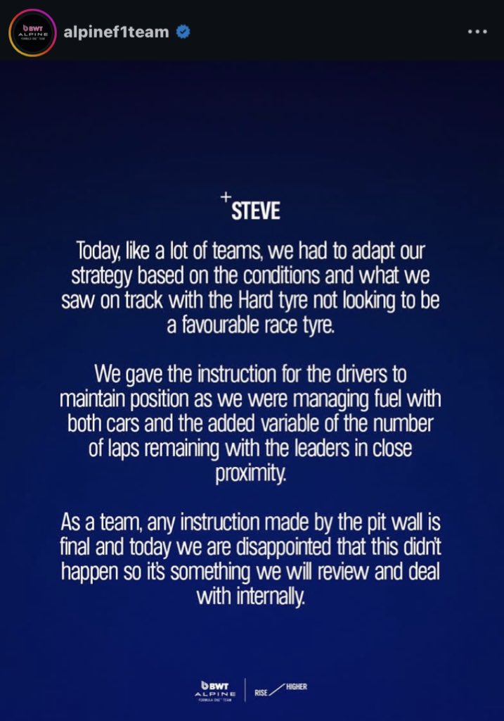 Alpine kende opnieuw een matig raceweekend in Austin. Pierre Gasly en Franco Colapinto eindigden respectievelijk als negentiende en zeventiende – geen punten dus voor het team uit Enstone. Colapinto baarde wél opzien met een late inhaalactie op zijn teamgenoot. Terwijl het team beide coureurs opdroeg hun posities vast te houden, trok de Argentijn zijn eigen plan. Alpine tikte hem via sociale media op de vingers, maar heeft dat bericht inmiddels verwijderd.