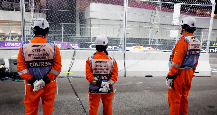 De openingsronde van de GP van Las Vegas werd opgeschrikt door meerdere botsingen in de eerste bocht. In de uitloopzone lagen brokstukken verspreid, waarop marshals vanaf hun post werden gesommeerd om het puin op te ruimen. Hoewel de stukken carbon op het eerste gezicht buiten de racelijn lagen, renden toch nog enkele marshals richting de vangrail om brokstukken te rapen. Raceleider Max Verstappen begon op dat moment al bijna aan zijn tweede ronde. Desondanks besloot de wedstrijdleiding slechts met dubbele gele vlaggen te zwaaien, in plaats van een virtuele safetycar in te zetten.