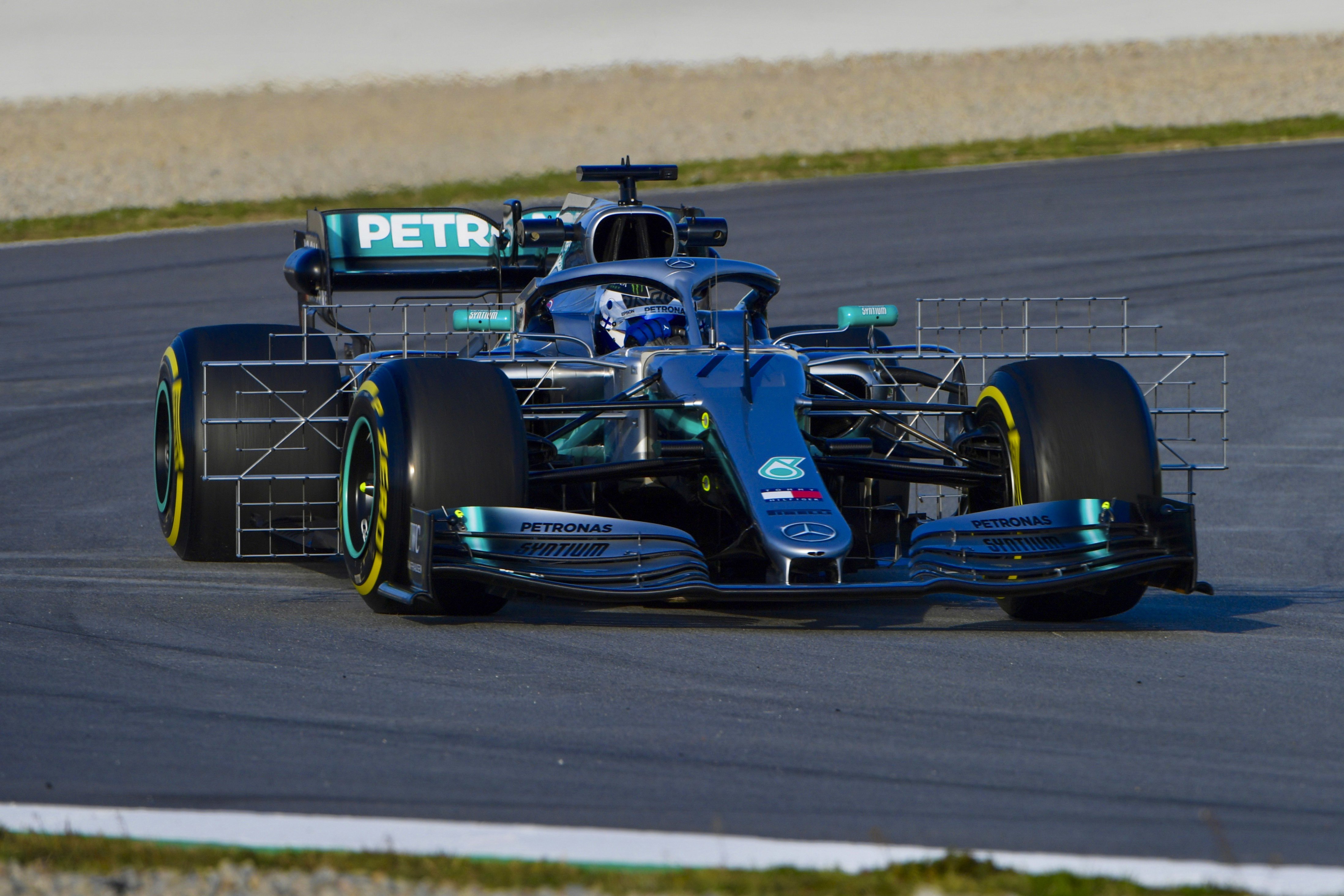 CIRCUIT DE BARCELONA-CATALUNYA, SPAIN – FEBRUARY 18: Valtteri Bottas, Mercedes AMG F1 W10, carries a test rig during the Barcelona February testing at Circuit de Barcelona-Catalunya on February 18, 2019 in Circuit de Barcelona-Catalunya, Spain. (Photo by Jerry Andre / Sutton Images)