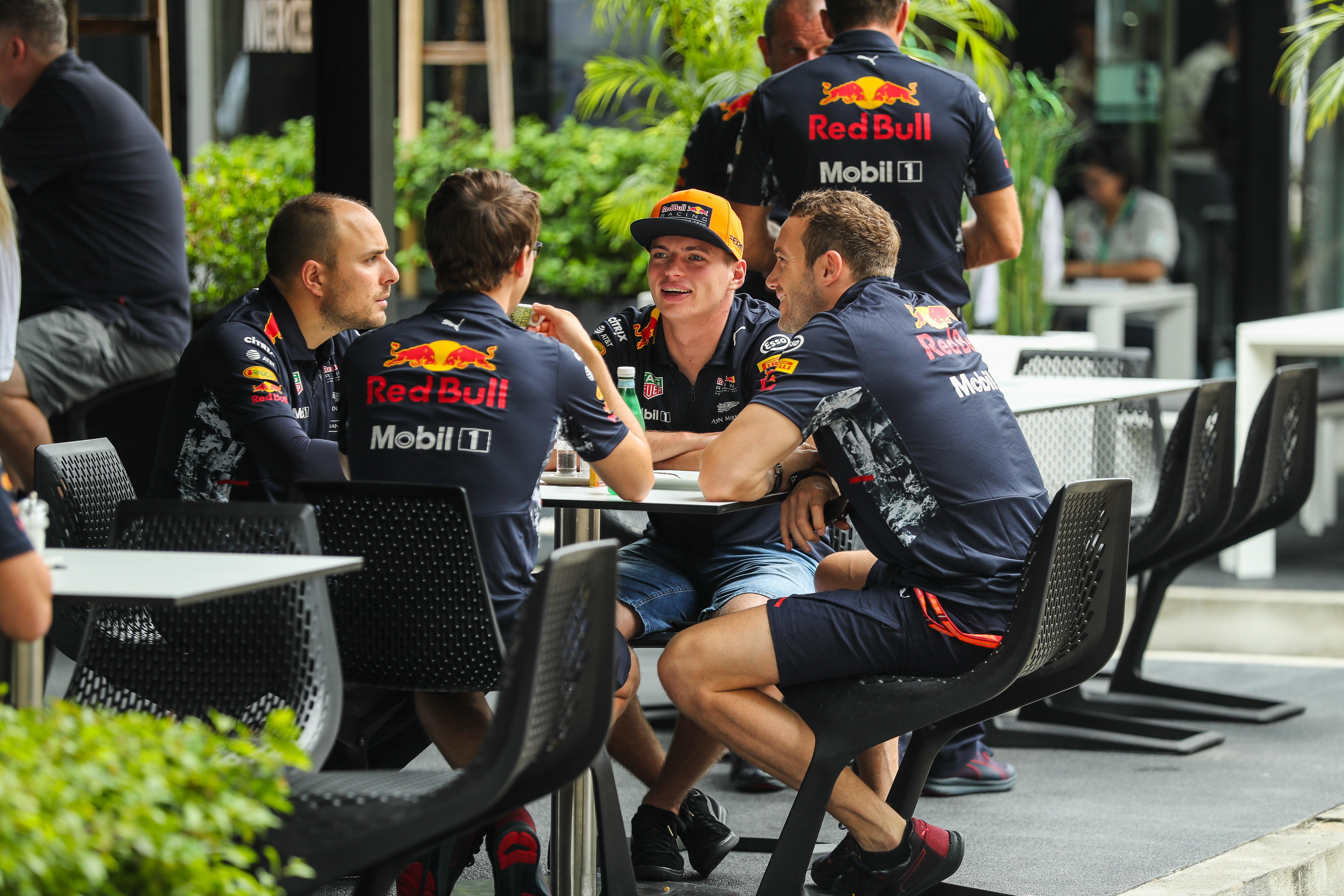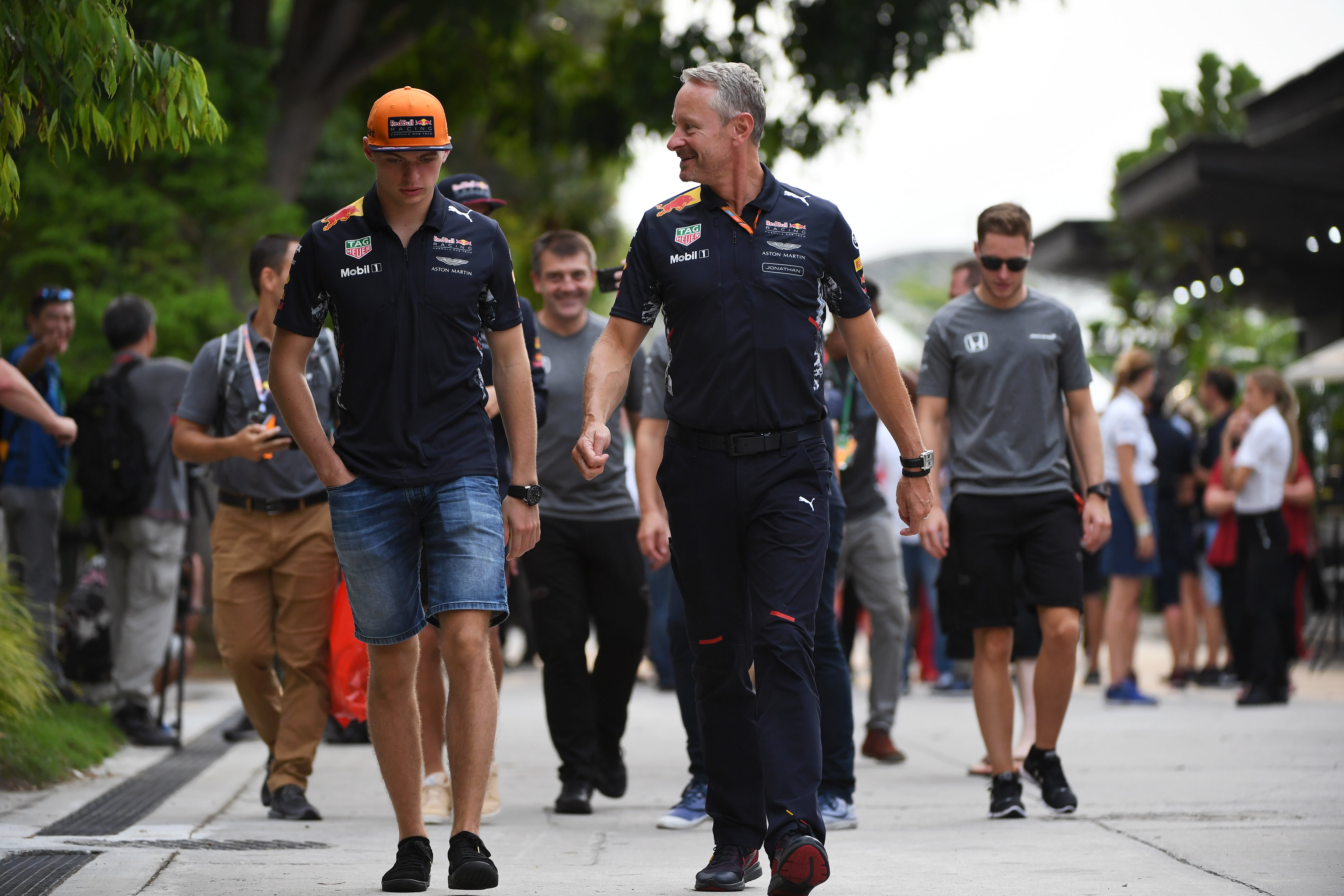 - Max Verstappen loopt samen met teammanager Jonathan Wheatley door de paddock.