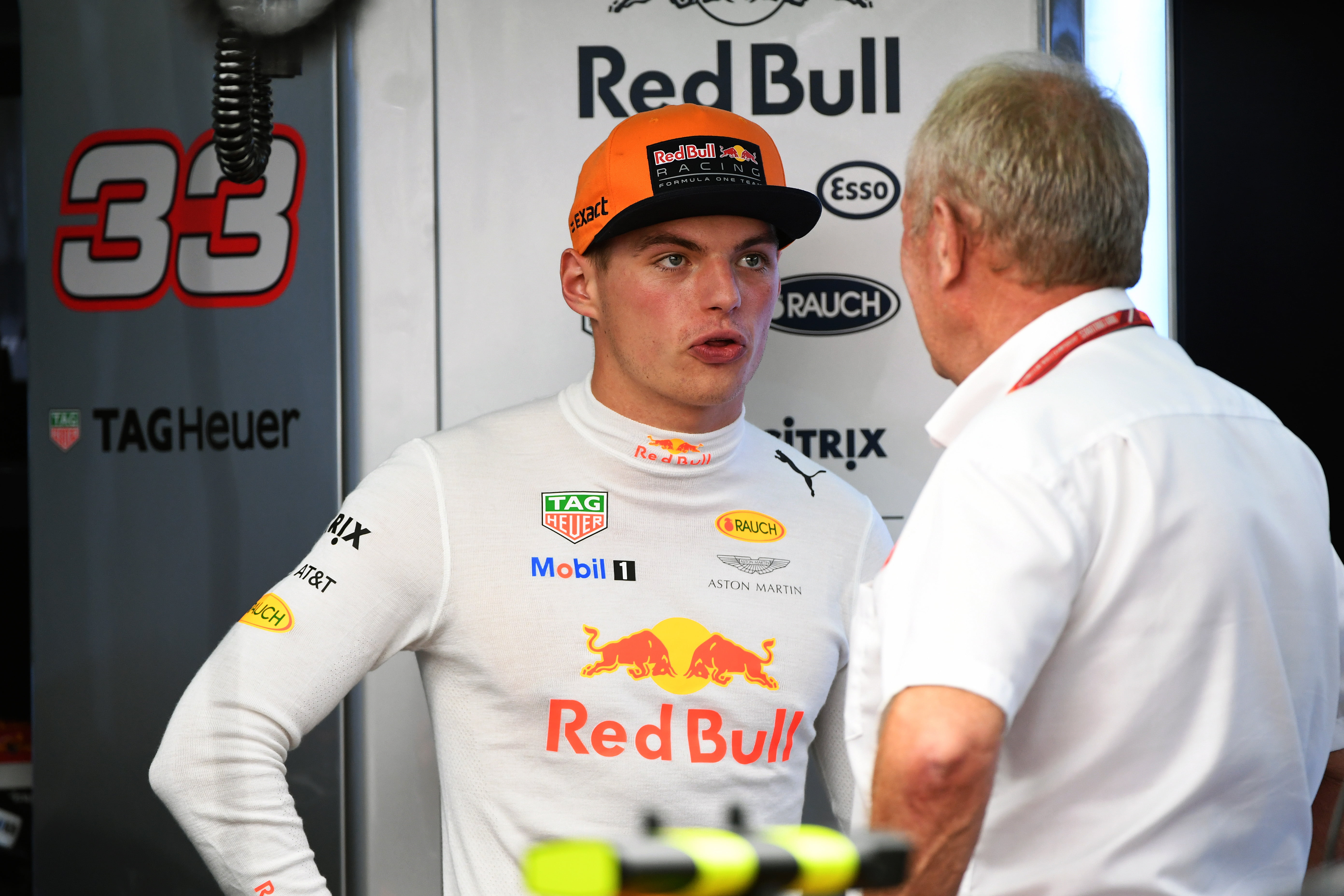 - Dr. Helmut Marko spreekt Verstappen nog even vaderlijk toe.