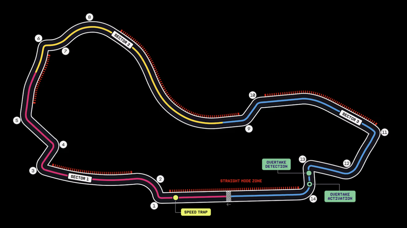 De eerste aanvalsmogelijkheid ligt op het rechte stuk van start en finish, waarbij het detectiepunt voor de Overtake Mode tussen bocht 13 en 14 is geplaatst. Coureurs die binnen één seconde van hun voorganger rijden, kunnen daar hun inhaalmodus activeren. Waar het elektrische vermogen normaal afneemt boven de 290 km/u, mogen zij met Overtake Mode het volledige vermogen van 350 kilowatt vasthouden tot 340 km/u. Opvallend is dat de modus al vóór bocht 14 geactiveerd kan worden, waardoor aanvallen eerder kunnen worden voorbereid dan in het DRS-tijdperk.