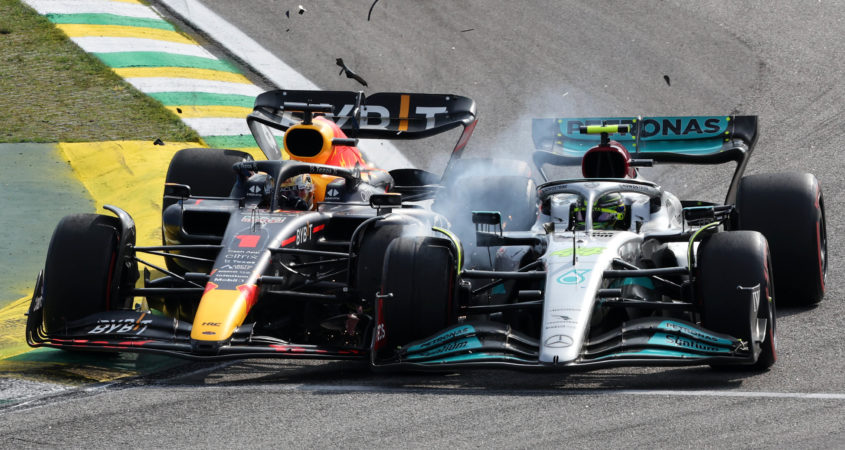 Een jaar na de Braziliaanse battle van 2021 – inclusief Hamilton die toen uit de kwalificatie werd geschrapt voor een onreglementair DRS-systeem, en Verstappen die 50.000 euro boete had gekregen voor het in parc fermé aanraken van diezelfde achtervleugel – ging het weer mis tussen de twee in Brazilië. Verstappen en Hamilton kwamen elkaar tegen bij de herstart in ronde zeven. Met Hamilton op P2, Verstappen derde en zicht op een eventuele zege.
