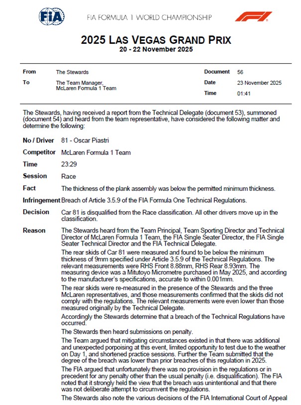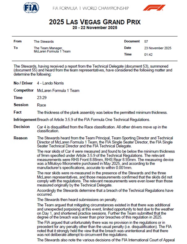 Enkele uren na de Grand Prix van Las Vegas zijn de McLaren-coureurs Lando Norris en Oscar Piastri gediskwalificeerd. Bij beide McLarens was de houten plank onder het chassis, de zogenoemde skid block, minder dik dan de minimale 9 millimeter. Door het genomen besluit is de titelstrijd weer volledig open en maakt Max Verstappen weer volop kans op titelprolongatie, met nog twee races en een sprintrace te gaan. Zie hieronder het officiële oordeel van de FIA-stewards.