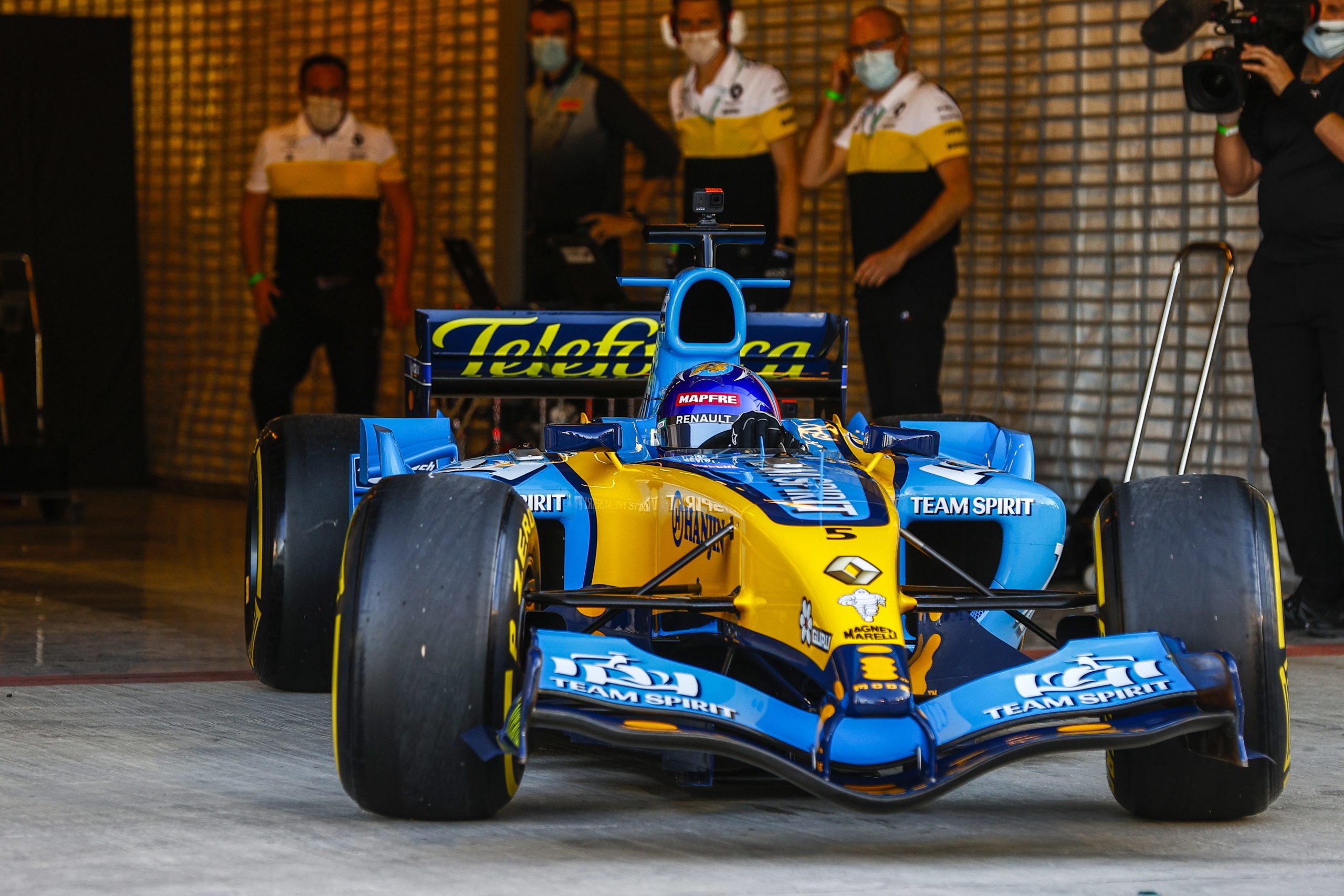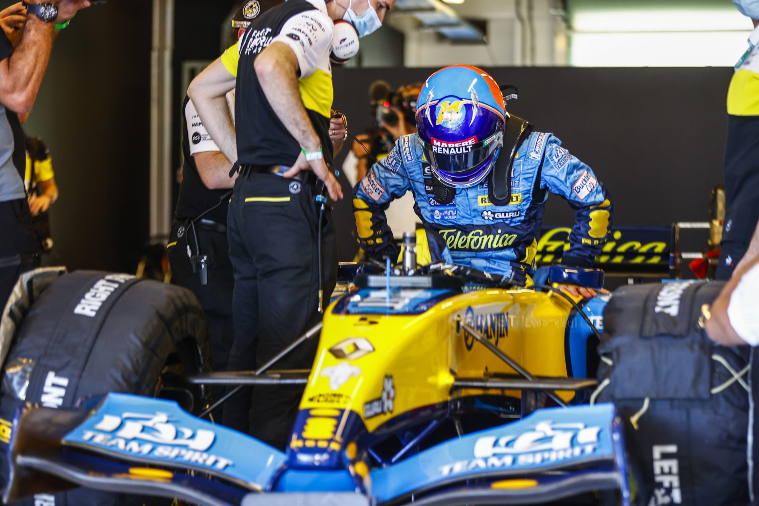 Fernando Alonso nam vrijdagmiddag tussen de eerste en tweede vrije training plaats in de R25, waarmee hij in 2005 wereldkampioen werd.