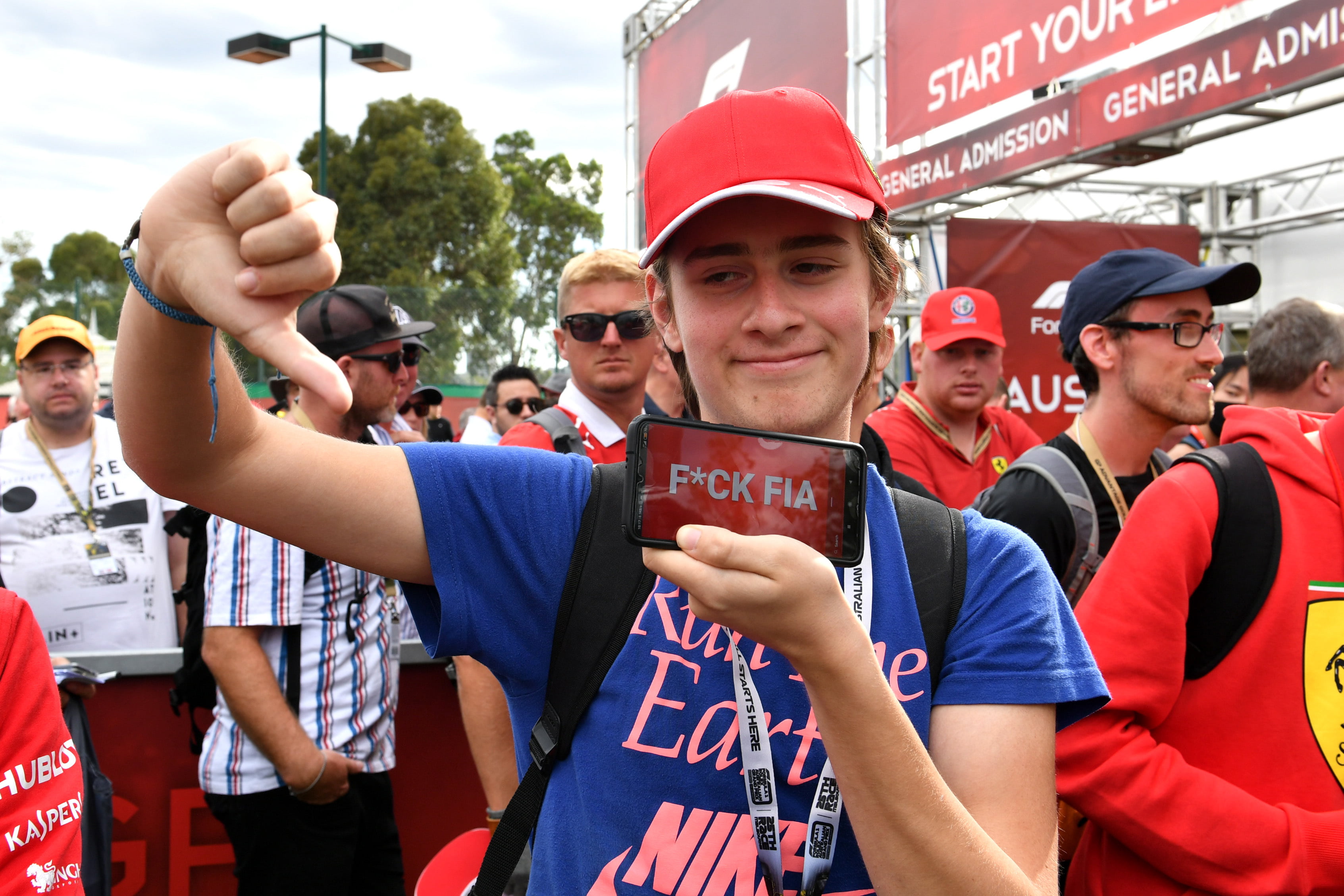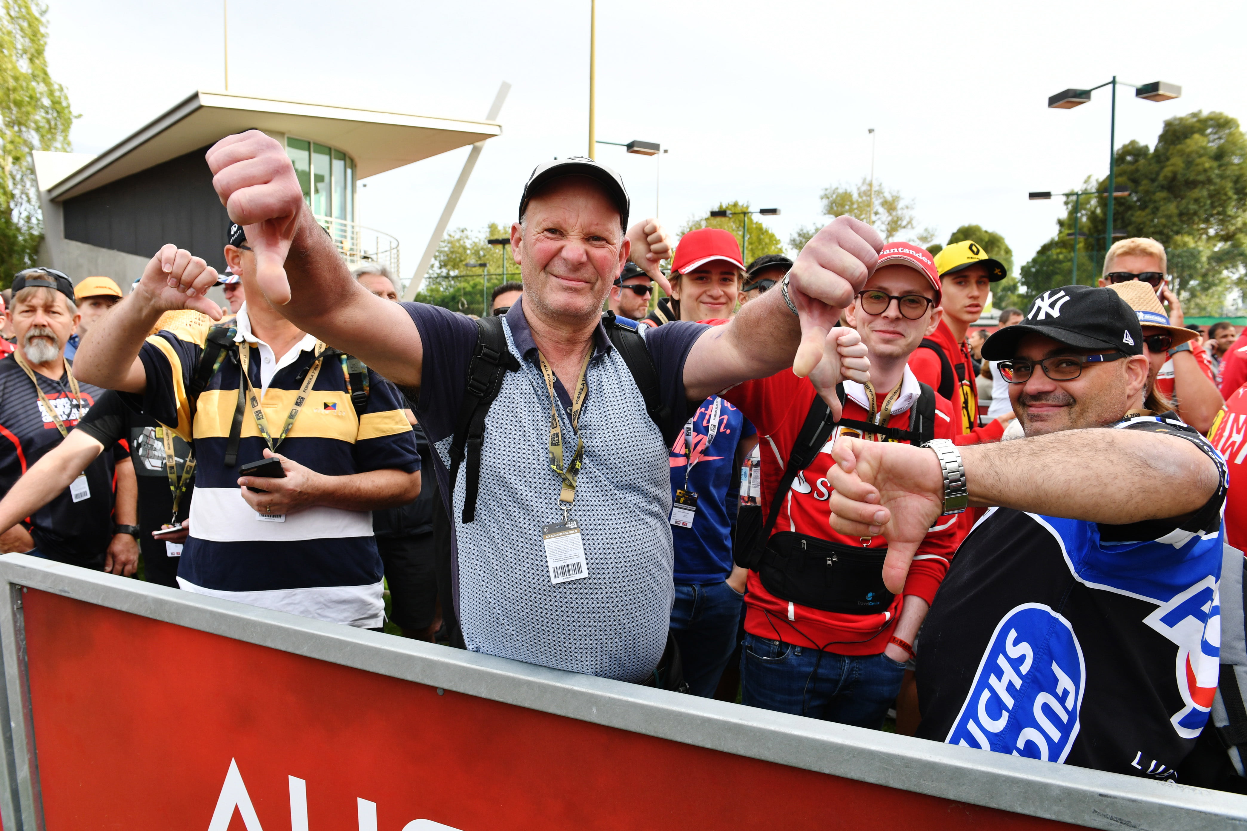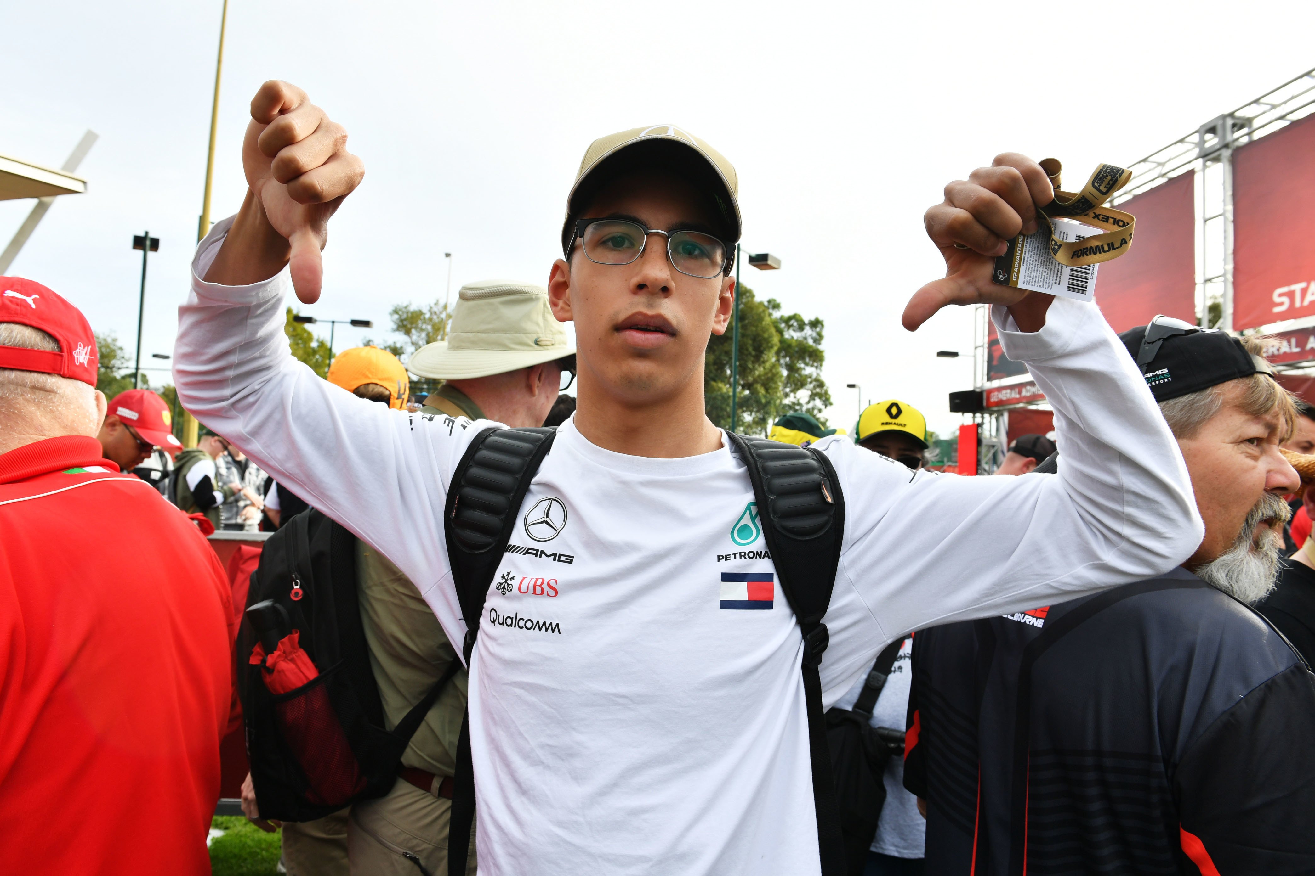 - MARCH 13: A disappointed Mercedes F1 fans gives a thumbs down gesture as the gates are delayed in opening during the Australian GP on March 13, 2020. (Photo by Mark Sutton / Sutton Images)