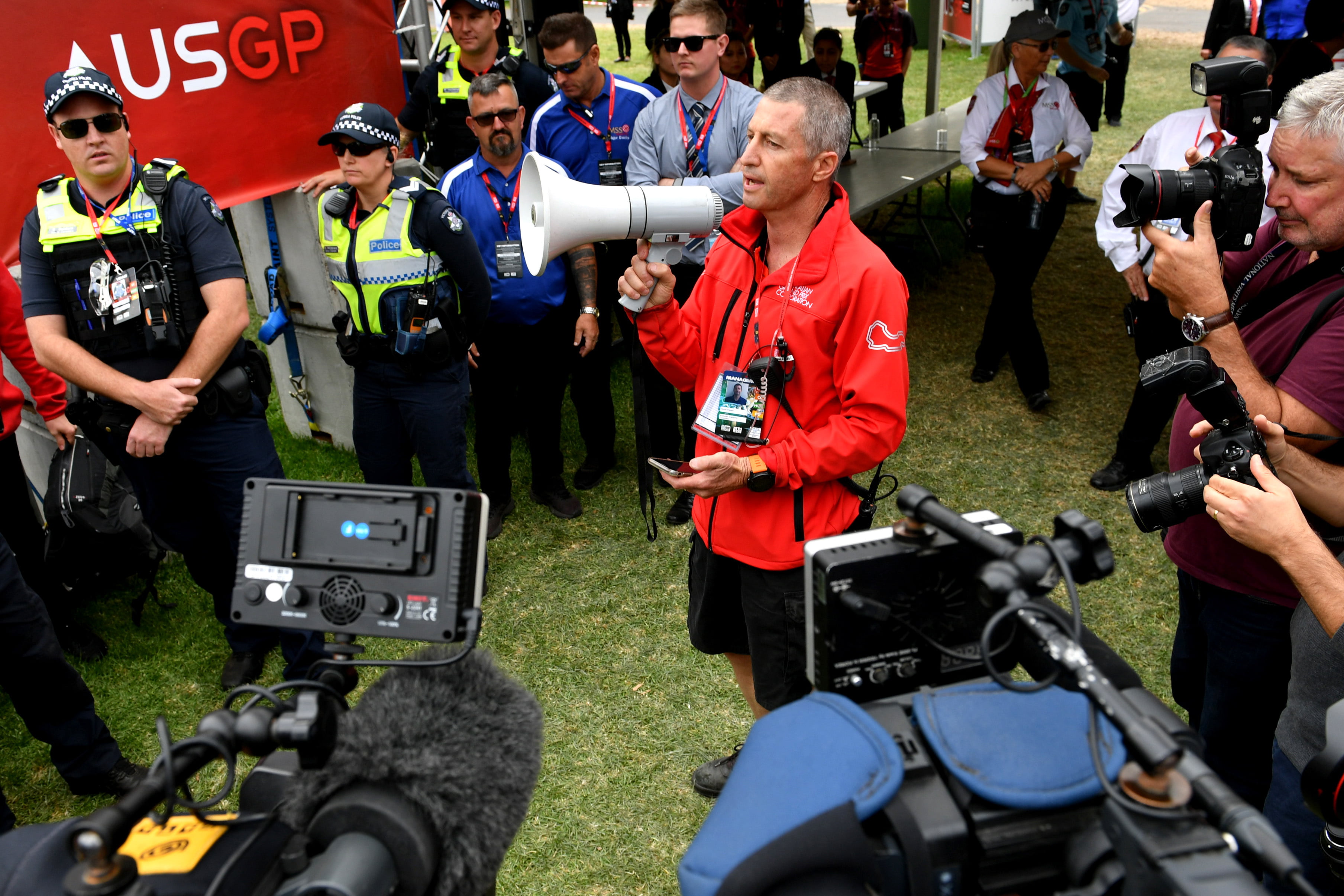 - MARCH 13: A member of the Australian Grand Prix Corporation makes an announcement during the Australian GP on March 13, 2020. (Photo by Mark Sutton / Sutton Images)
