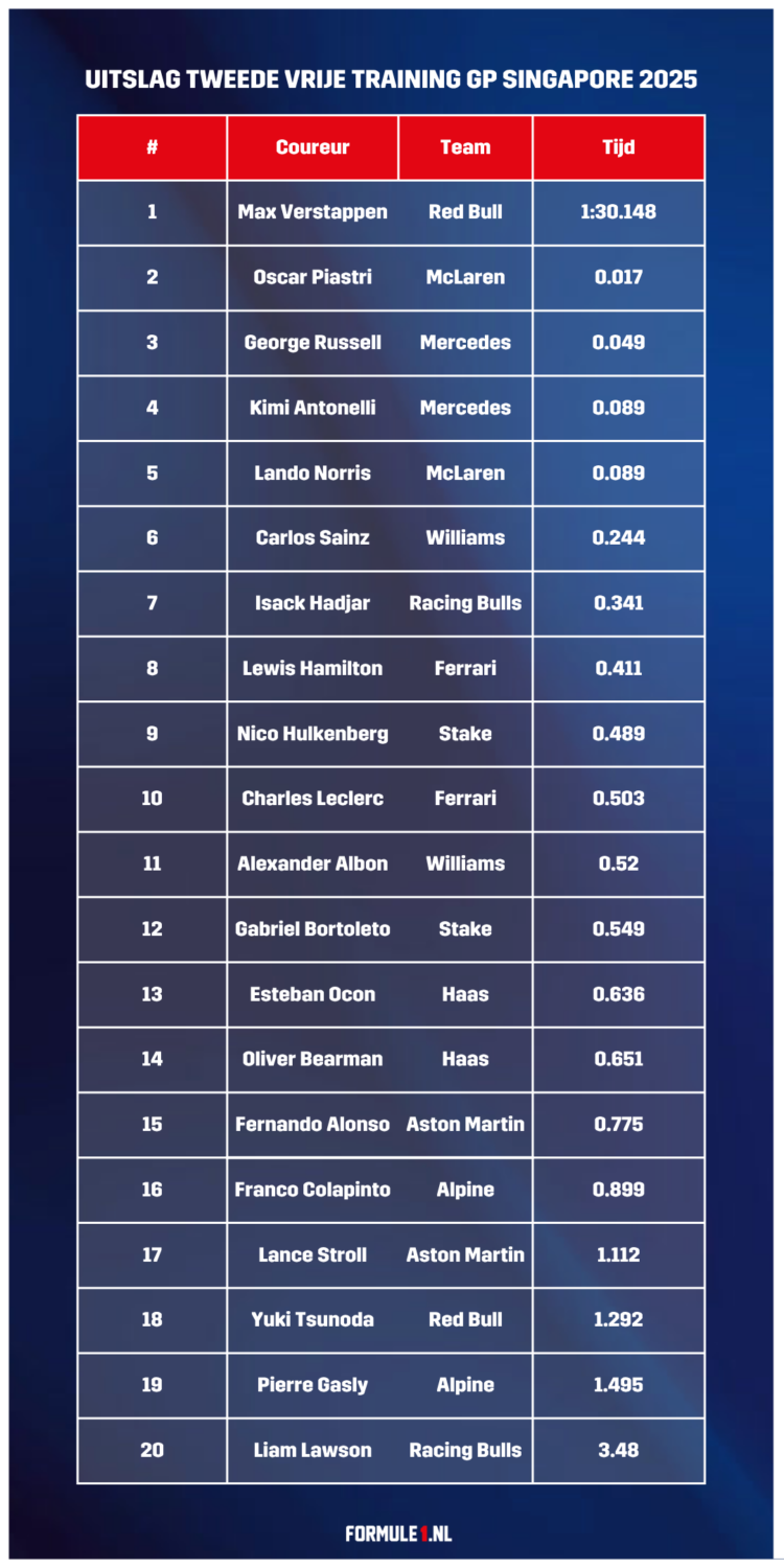 Max Verstappen sluit de derde vrije training in Singapore af als snelste! In de slotminuten pakt Oscar Piastri nog de tweede tijd, waardoor George Russell genoegen moet nemen met de derde tijd. Bekijk hieronder de volledige uitslag van de derde vrije training tijdens de GP van Singapore 2025.
