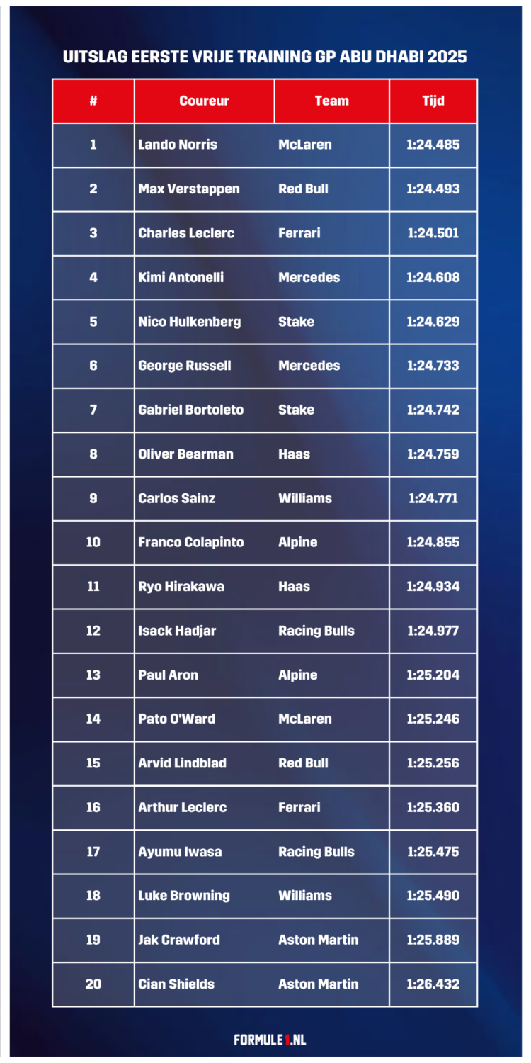 Lando Norris is de snelste deze sessie! Max Verstappen noteert de tweede tijd met een verschil van +0,008. Charles Leclerc maakt de top drie compleet. Bekijk hieronder de volledige uitslag van de eerste vrije training tijdens de GP van Abu Dhabi 2025.