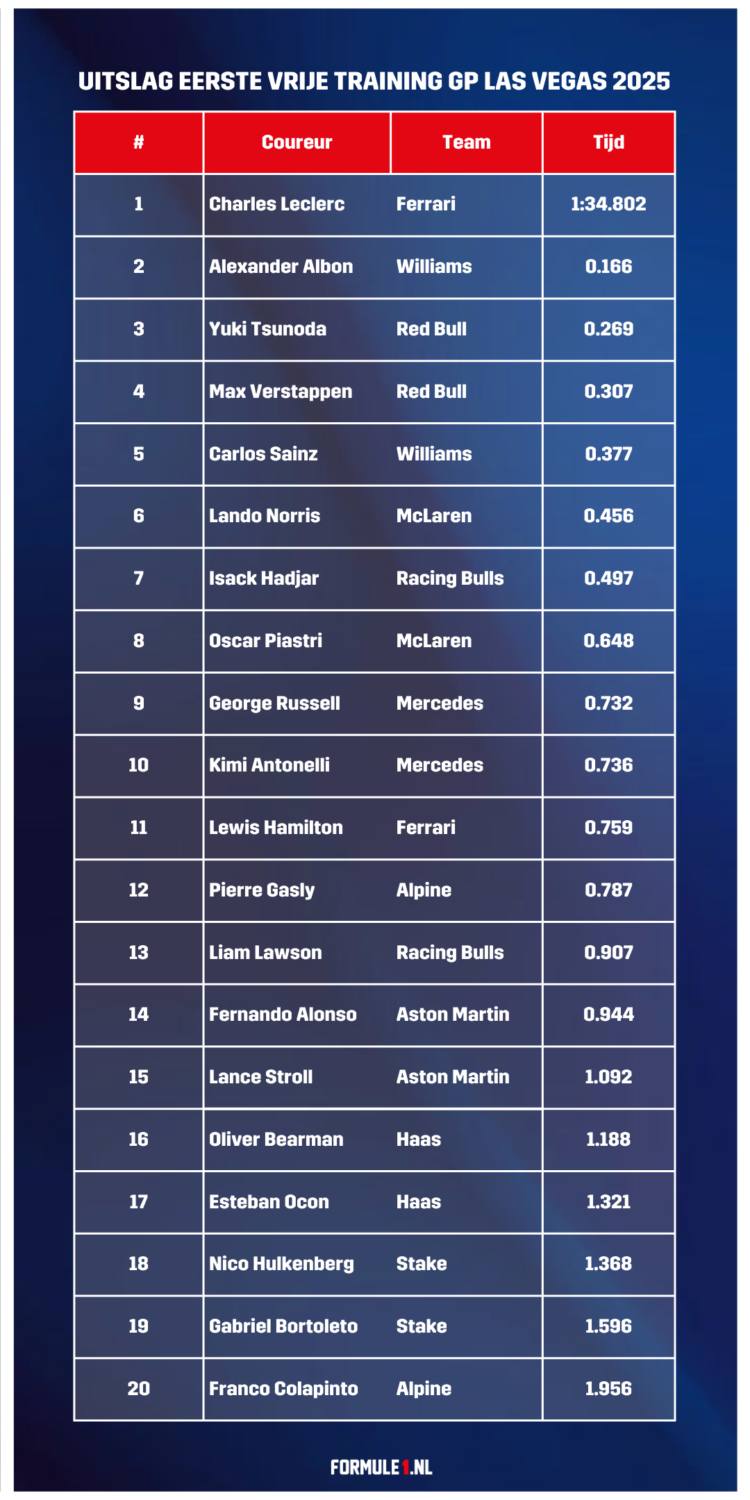 Charles Leclerc is de snelste deze sessie. Alexander Albon redt het niet en noteert de tweede tijd. Max Verstappen rijdt de vierde tijd. Opvallend is dat zijn teamgenoot, Yuki Tsunoda, deze sessie sneller is dan de Nederlander. De Japanner maakt de top drie compleet. Bekijk hieronder de volledige uitslag van de eerste vrije training tijdens de GP van Las Vegas 2025.