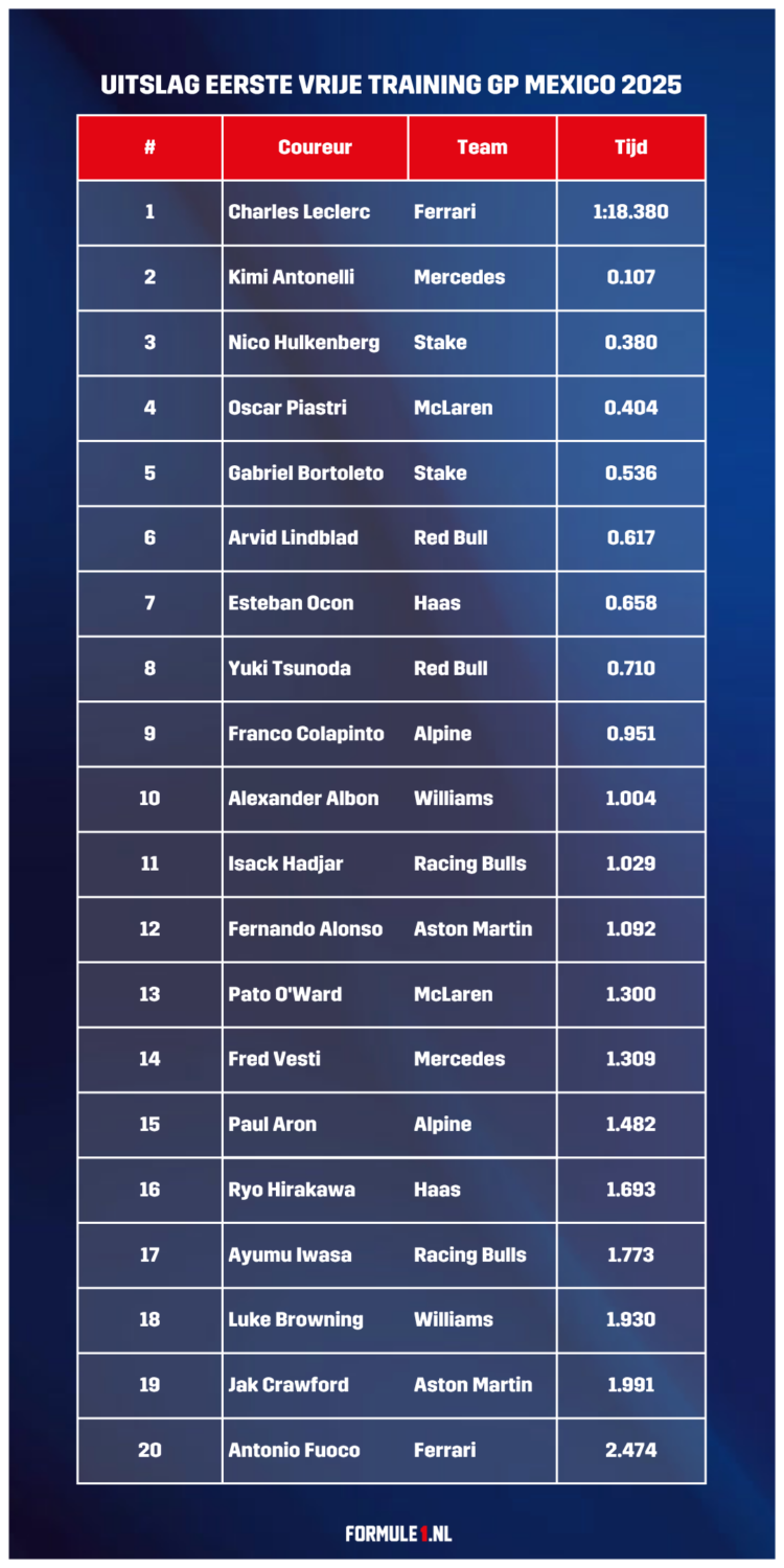 Met negen rookies in deze vrije training is het Charles Leclerc die de snelste tijd noteert. Kimi Antonelli moet genoegen nemen met de tweede plaats. Verrassend is Nico Hülkenberg: hij noteert de derde tijd van de sessie. Bekijk hieronder de volledige uitslag van de eerste vrije training tijdens de GP van Mexico 2025.