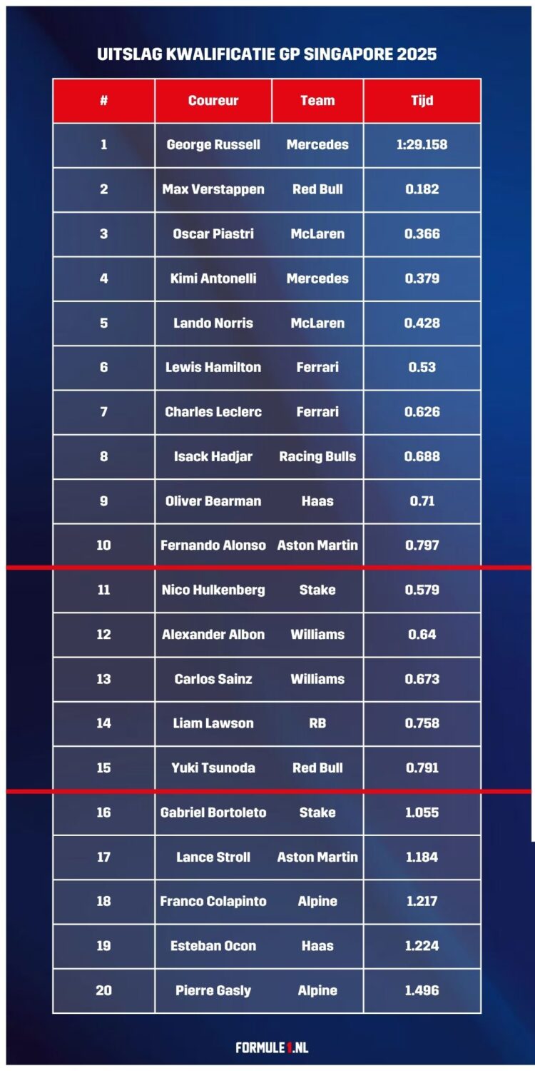 George Russell heeft de snelste tijd neergezet in de kwalificatie voor de Grand Prix van Singapore en start zondag vanaf poleposition. Op het uitdagende Marina Bay Street Circuit bleef hij Max Verstappen en Oscar Piastri voor. Hieronder de volledige uitslag van de kwalificatie.