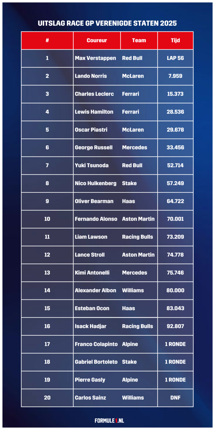 Max Verstappen wint de Grand Prix van Amerika! Lando Norris weet in de slotfase Charles Leclerc te passeren en pakt P2. De Ferrari-coureur moet genoegen nemen met de derde plaats. Bekijk hieronder de volledige uitslag van de GP van de Verenigde Staten 2025.