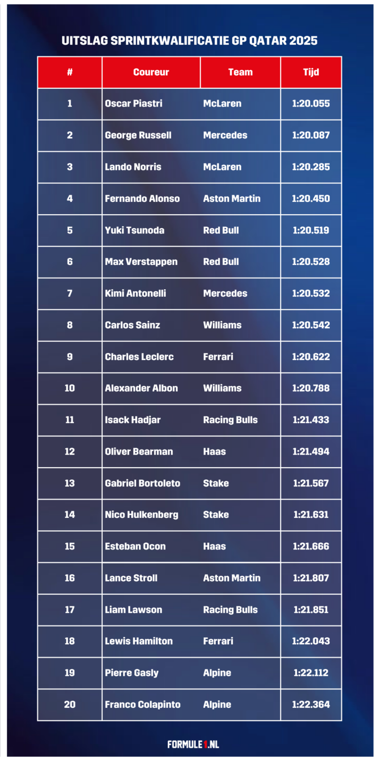 Pole-position voor Oscar Piastri! Mercedes-coureur George Russell noteert de tweede tijd. Lando Norris maakt de top drie compleet. Max Verstappen maakt een fout in het laatste deel van de kwalificatie en noteert met een beschadigde auto toch een zesde tijd. Bekijk hieronder de volledige uitslag van de sprintkwalificatie tijdens de GP van Qatar 2025.