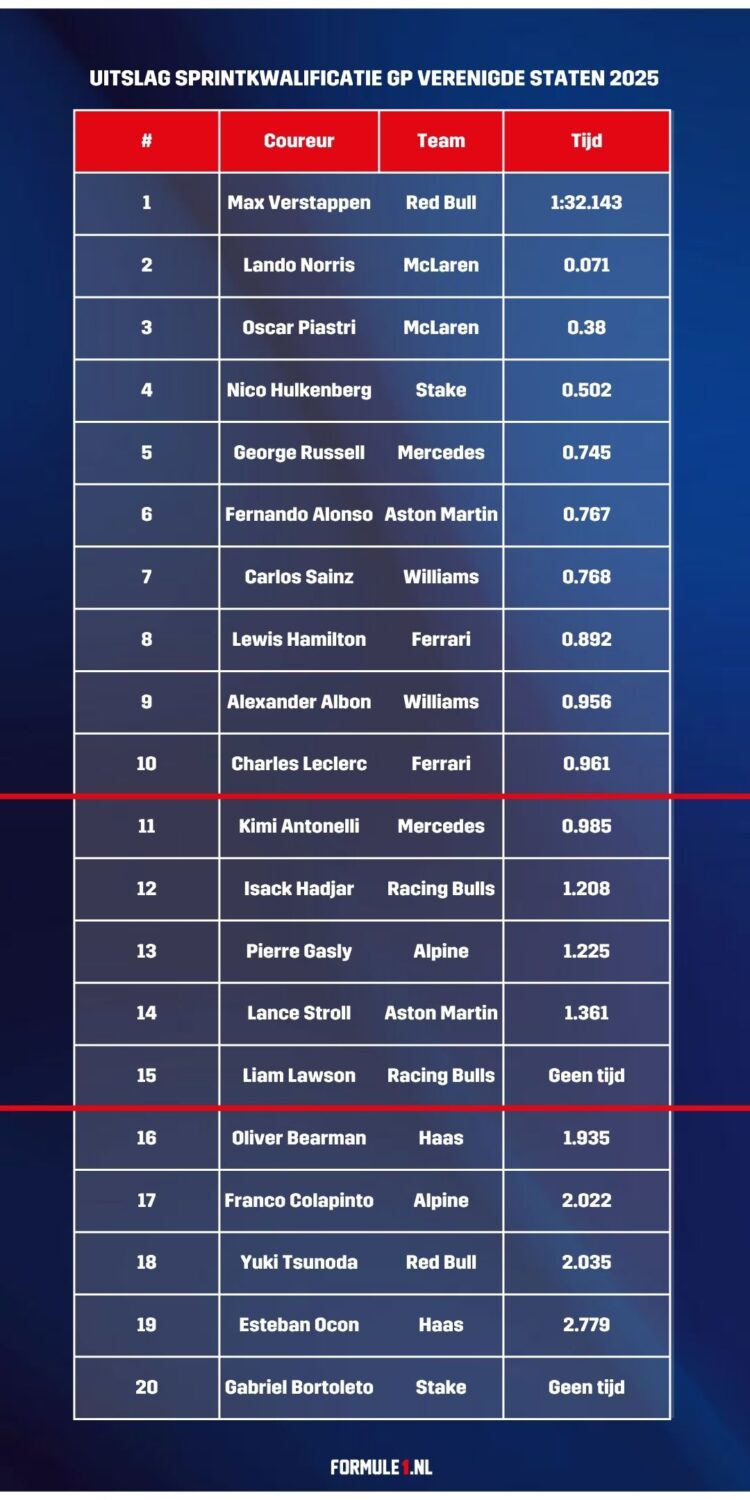 Max Verstappen heeft de snelste tijd veroverd tijdens de zinderende sprintkwalificatie voor de GP van de Verenigde Staten. De Nederlander start zaterdag de sprintrace vanaf pole position in Austin en ziet Lando Norris naast hem op de eerste startrij. Bekijk hieronder de volledige uitslag van de sprintkwalificatie voor de GP van de Verenigde Staten 2025.