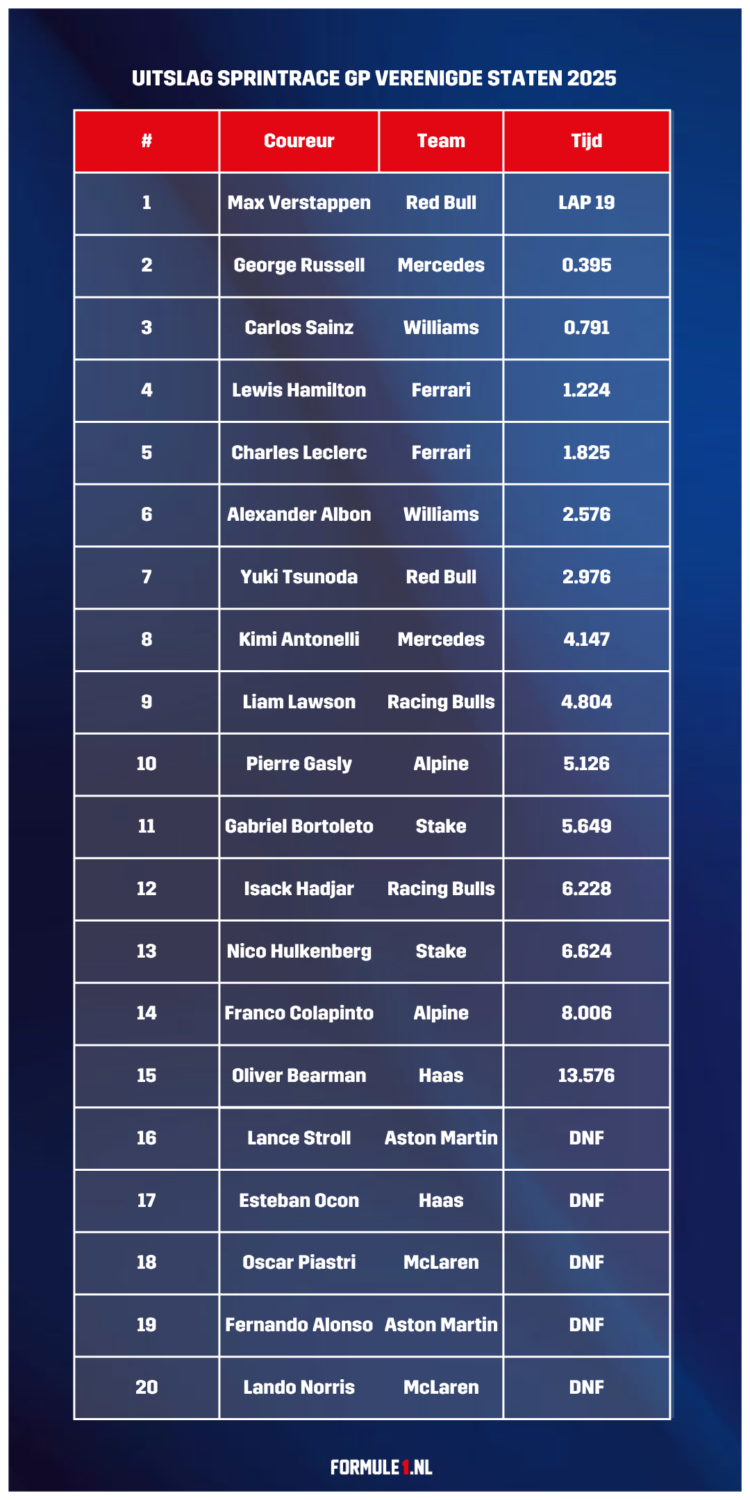 Max Verstappen wint de sprintrace in Austin! Hij finisht onder de safety car voor George Russell. Carlos Sainz maakt de top drie compleet. Bekijk hieronder de volledige uitslag van de sprintrace tijdens de GP van Amerika 2025.