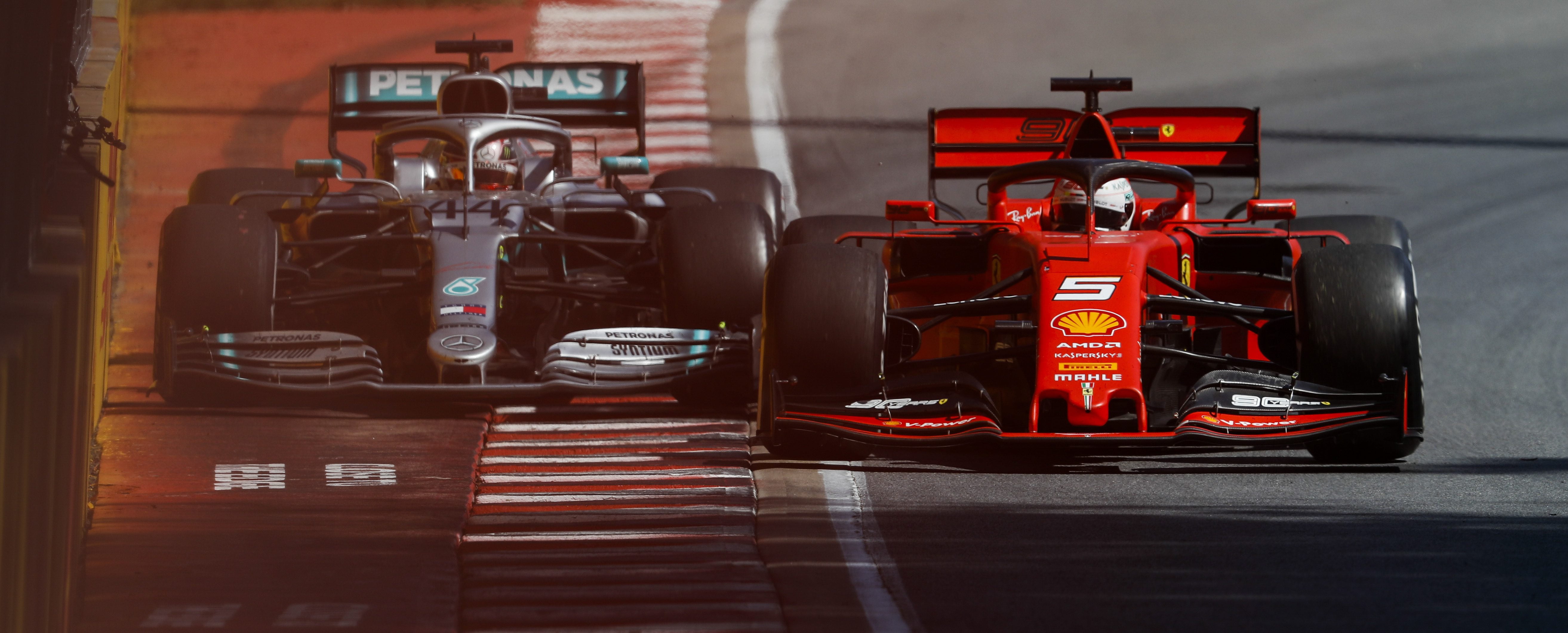 CIRCUIT GILLES-VILLENEUVE, CANADA – JUNE 09: Sebastian Vettel, Ferrari SF90 and Lewis Hamilton, Mercedes AMG F1 W10 battle during the Canadian GP at Circuit Gilles-Villeneuve on June 09, 2019 in Circuit Gilles-Villeneuve, Canada. (Photo by Zak Mauger / LAT Images)