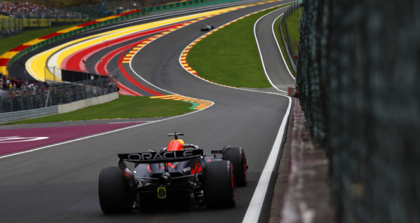 In de eerste training domineert hij een uur lang, vanaf de eerste ronde. Op beide gebruikte bandensoorten (hard en zacht) is hij zijn concurrenten te snel af. Oscar Piastri volgt op een halve seconde, Alex Albon in de Williams – knap – als derde op ruim zeven tiende. Verstappens teamgenoot Sergio Pérez die zwaar onder druk staat bij Red Bull, maakt in de eerste training voorlopig weinig indruk. De Mexicaan is bijna een seconde langzamer dan zijn Nederlandse collega, die in de Ardennen een man met een missie lijkt.