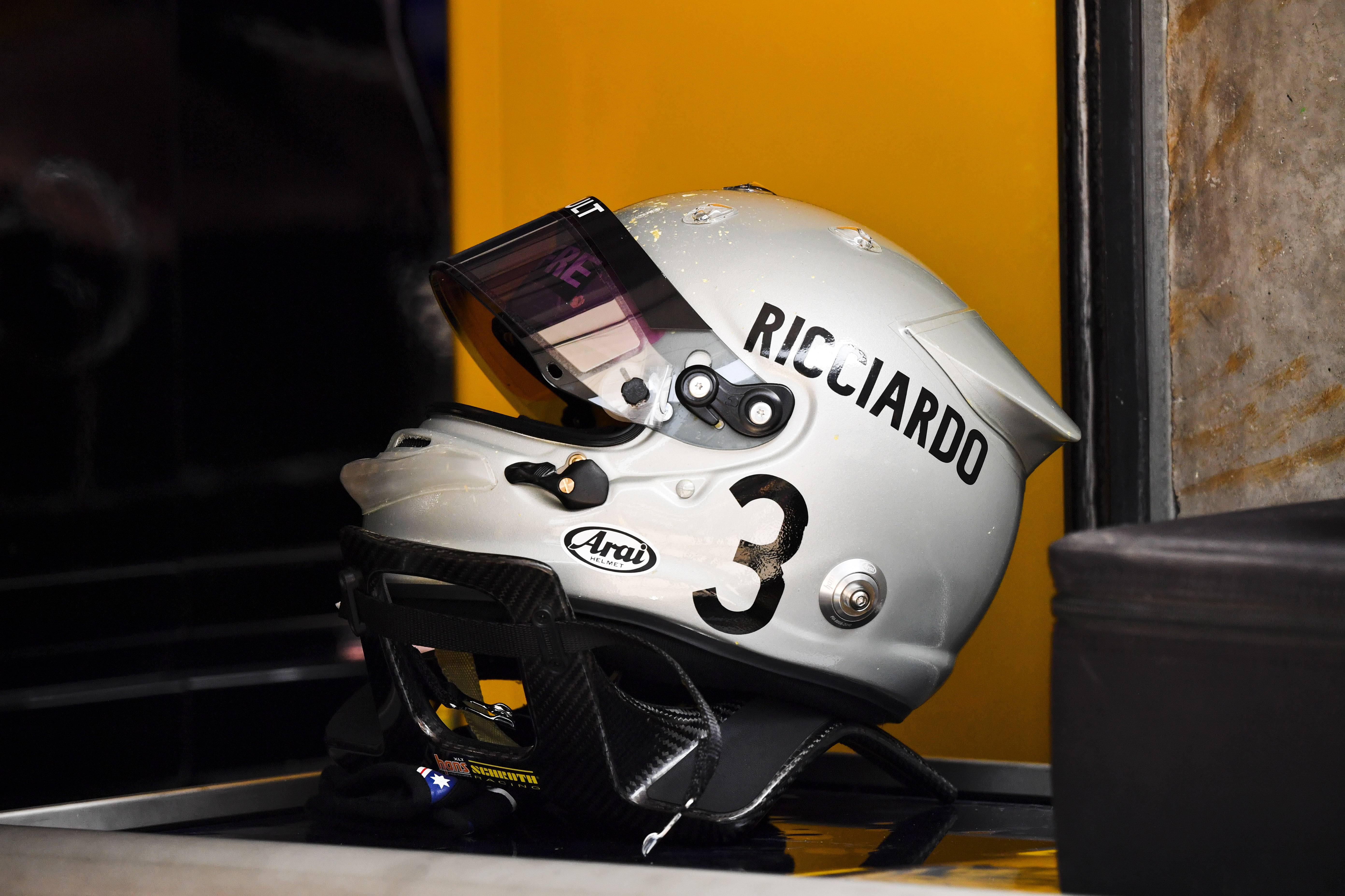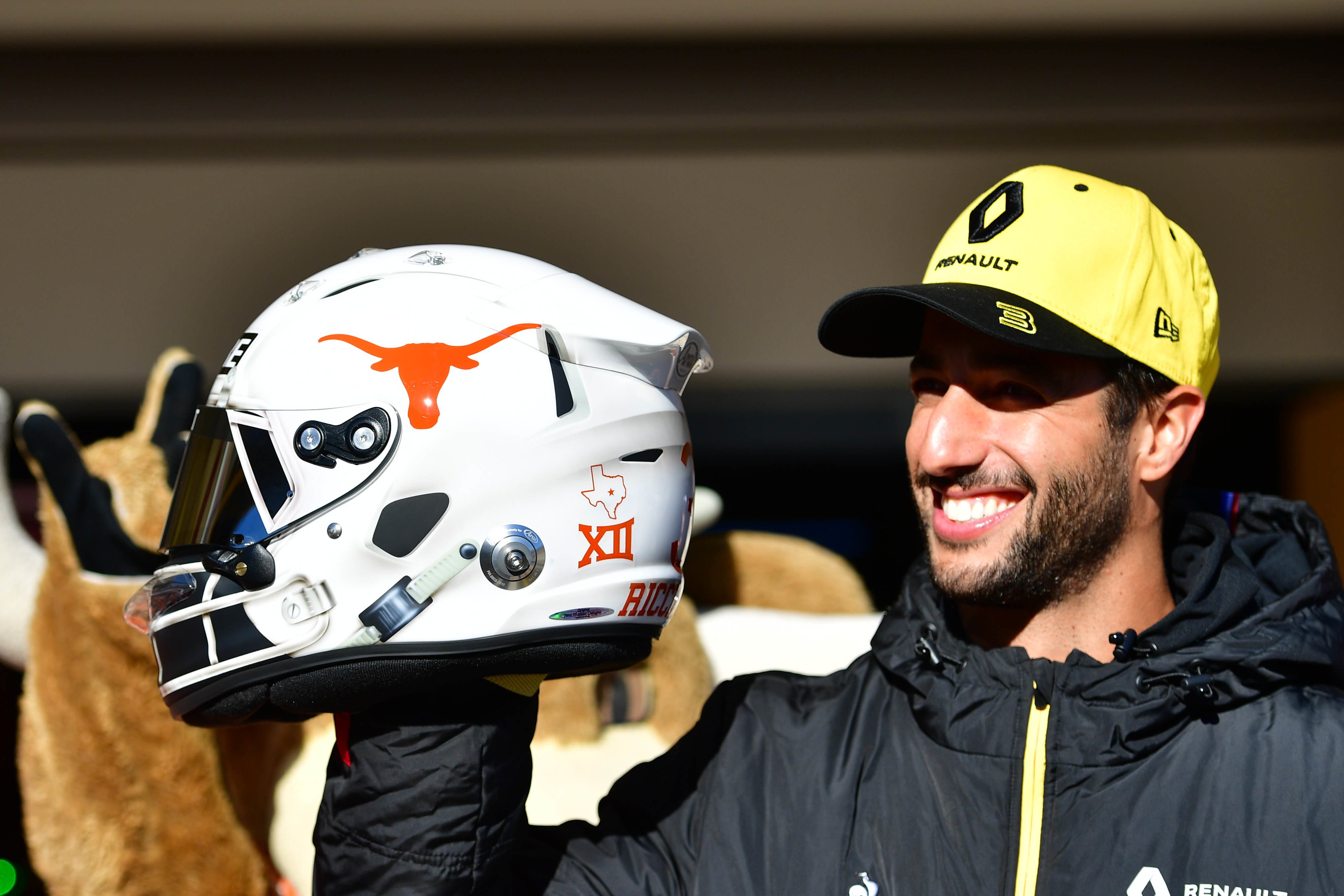 - AUSTIN, TEXAS – OCTOBER 31: Daniel Ricciardo, Renault F1 Team, meets Texas Longhorn cheerleaders, and displays a new helmet design during the 2019 Formula One United States Grand Prix at Circuit of the Americas, on October 31, 2019 in Austin, Texas, USA. (Photo by Simon Galloway / Sutton Images)