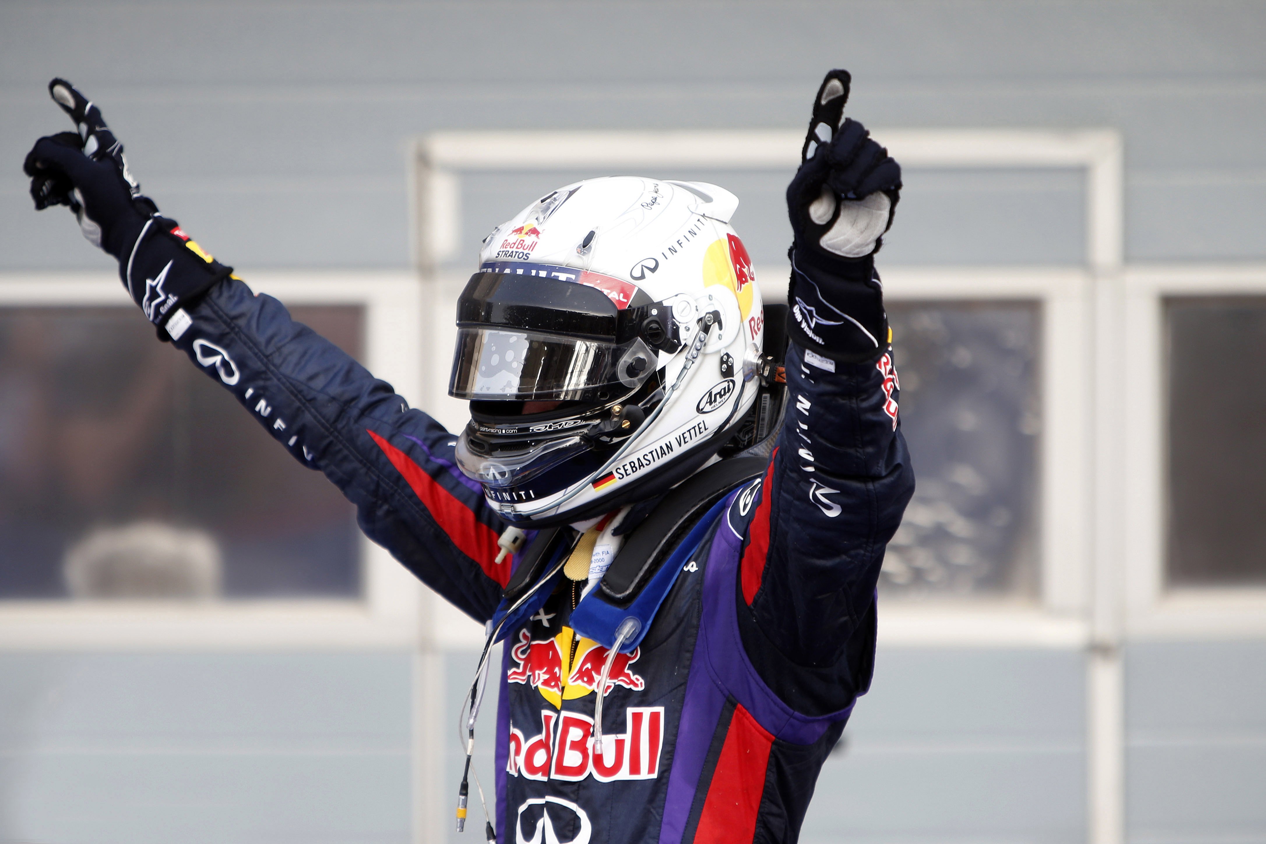 - Bahrain International Circuit, Sakhir, Bahrain Sunday 21st April 2013 Sebastian Vettel, Red Bull Racing, 1st position, celebrates victory in Parc Ferme. World Copyright: Glenn Dunbar/LAT Photographic ref: Digital Image _89P5940