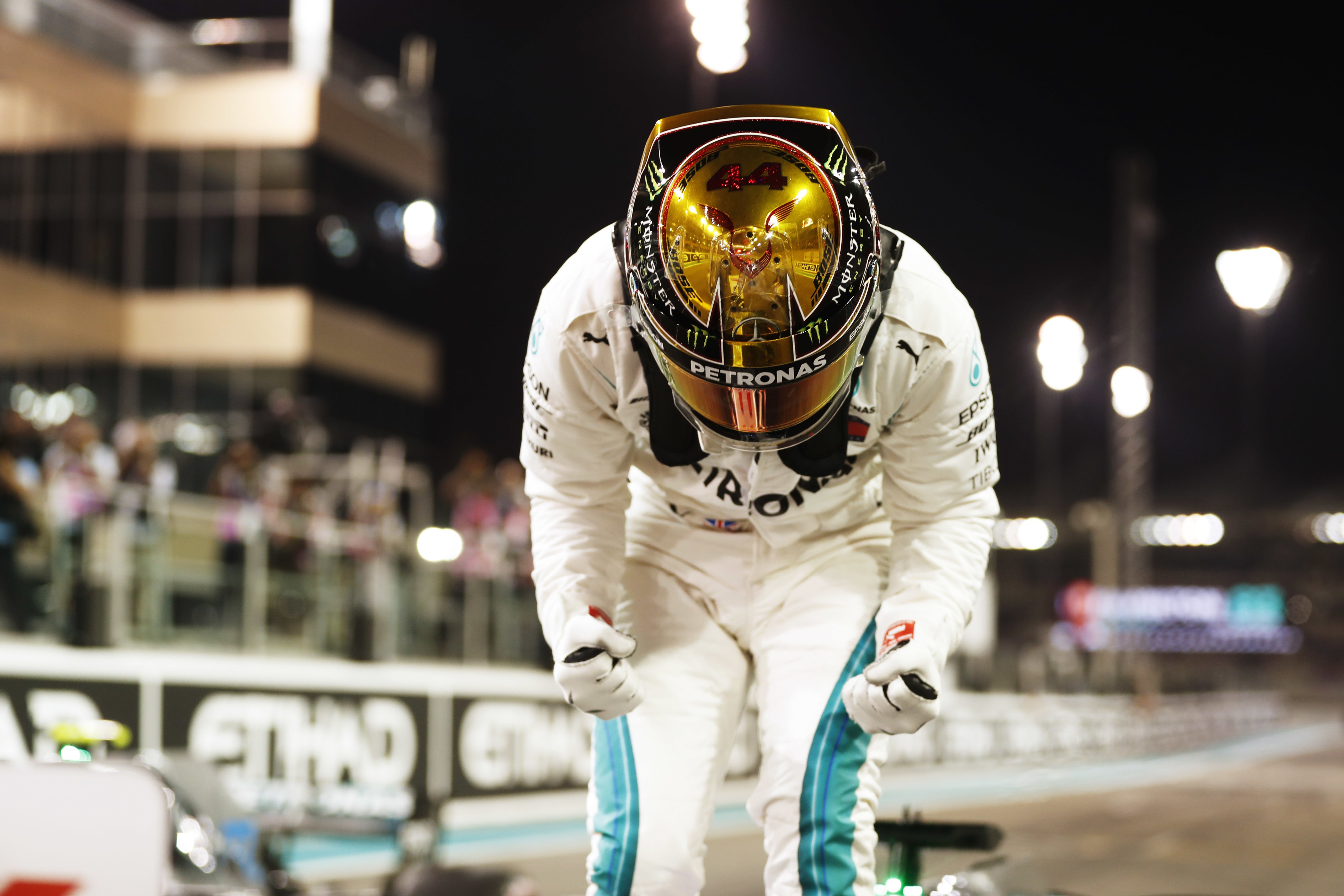 - YAS MARINA CIRCUIT, UNITED ARAB EMIRATES – NOVEMBER 24: Lewis Hamilton, Mercedes AMG F1, celebrates after taking pole position during the Abu Dhabi GP at Yas Marina Circuit on November 24, 2018 in Yas Marina Circuit, United Arab Emirates. (Photo by Steven Tee / LAT Images)
